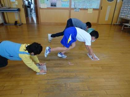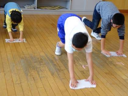 今日は金曜日、週の最終日は水拭き掃除の日です。ぞうきんをしっかり絞って「用意、ドン!」きれいに拭き掃除をしてくれました。