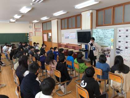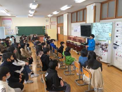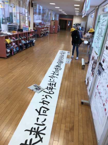 3枚目の写真は、集会名を書いた模造紙を眺める6年生です。いよいよ卒業だという気持ちが高まってきているようです。