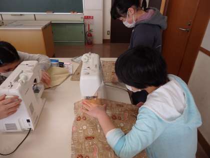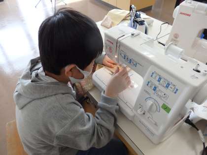 ミシンの使い方にもだいぶ慣れ、まっすぐ縫うのも上手になりました。下糸や上糸を入れるのも、友達と協力しながら頑張っています。