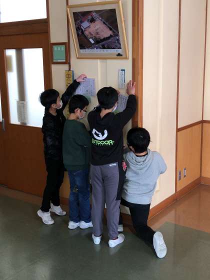 お気に入りの詩を視写したものを各階に貼っていましたが、今日をもって掲示を終了します。今後は、図画工作科の作品を掲示します。