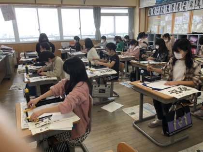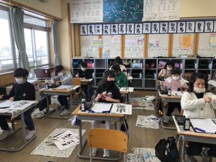 「出発」という文字に挑戦しました。筆はしっかりと立てて、気持ちを集中させて取り組んでいます。
