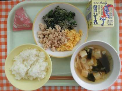 今日の献立は、そぼろ丼、よごし、すまし汁、ひなあられ、牛乳です。