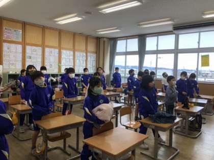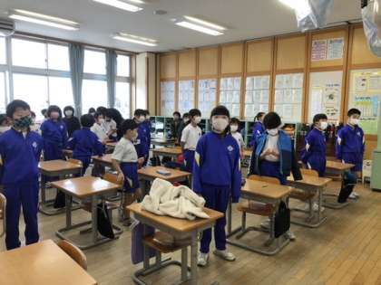 マスクを着用して歌います。2月の歌「心が今日も笑顔」は今日でおしまい。心を込めて歌っています。