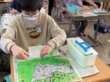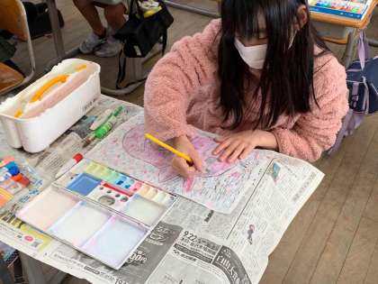 版画印刷した紙に裏から絵の具を塗り、色をつけていきます。
