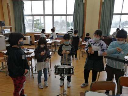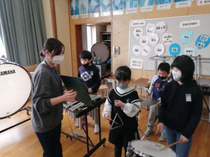 3年 音楽科「おかしのすきなまほう使い〜いろいろな音のひびきを感じ取ろう〜」 公開日 2022/03/02 更新日 2022/03/02 3年生 「おかしのすきなまほう使い」は、少しあわてんぼうの魔法つかいの様子をユーモラスに描いた歌詞の曲です。今日は、「魔法をかける音」づくりを行いました。トライアングル、すず、太鼓、シンバル、鉄琴、木琴…いろいろな楽器を使って、音づくりを行いました。「どんなふうに鳴らすと魔法をかける感じがするかな?」グループで話し合って考えては試していました。