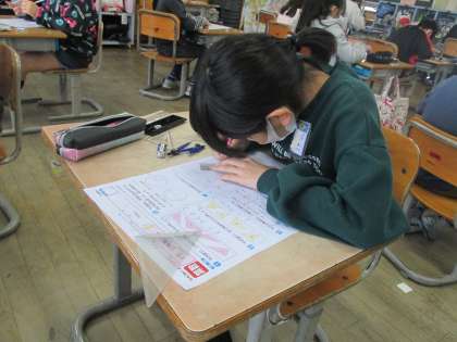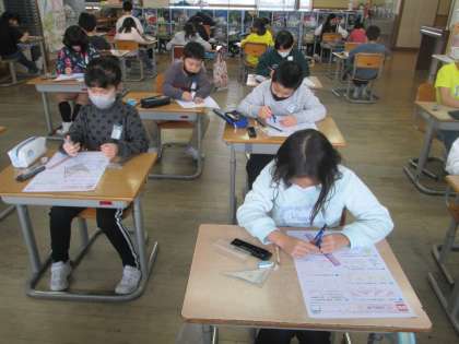 算数科のテストをしました。コンパスで二等辺三角形や正三角形を書いたあとも、ものさしで長さがあっているか確認していました。見直しもバッチリですね。
