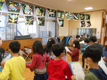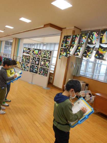 ローラーでつくった版画の鑑賞をしました。すてきだなと思う作品について、鑑賞カードに書きました。友達の発想に感心していました。