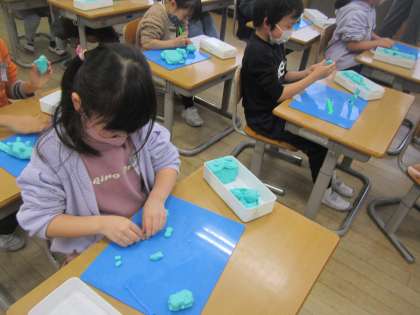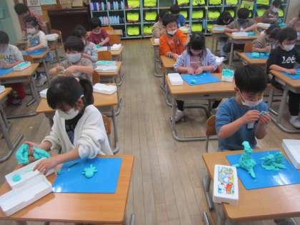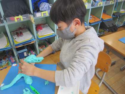 図画工作では「いっしょにおさんぽ」をテーマに、粘土あそびをしました。誰とどこに行きたいか考え、全部の粘土を使って作品を作りました。「恐竜に乗ってお散歩したい!」「お母さんと一緒にお散歩したいな。」「公園をお散歩するのも楽しそう!」など、イメージを膨らませながら作品を作っていました。