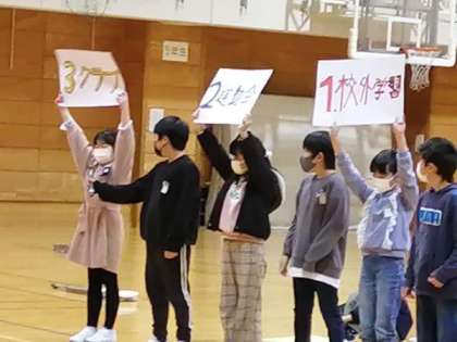 4年生が出題したクイズに、6年生は大はしゃぎ。「現在の校長先生は、何代目でしょう?」「担任の先生の好きな給食は何でしょう?」等、いろいろな3択クイズに、笑顔があふれました。