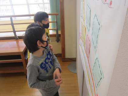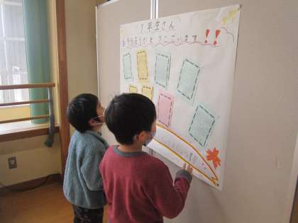 「卒業を祝う会」を終え、6年生からのお礼のメッセージが届きました。嬉しそうにメッセージを読んでいました。「漢字にふりがなをつけてくれている!」「6年生って字がきれいだなあ。」「可愛いイラストも描いてくれている!」など、メッセージから6年生の優しさを感じていました。