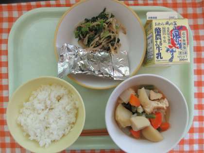 今日の献立は、ごはん、サバの銀紙焼き、ごまびたし、関東だき、牛乳です。