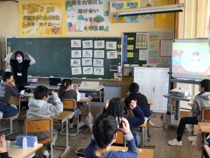 音楽に合わせてジェスチャーを付けて楽しく歌っています。