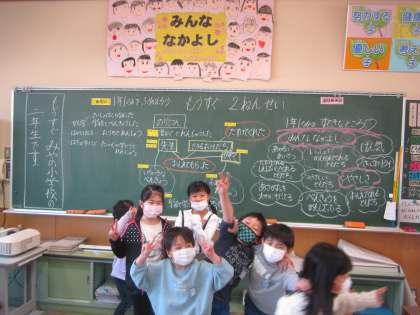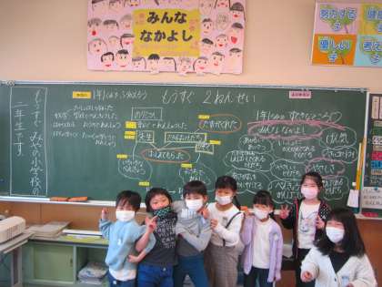 黒板の写真を撮ろうとするときに、いつも「写真撮って〜!」「一緒に映りたい!」「もう一枚撮ろう!」と子供たちが集まってきます。仲良しで、可愛らしい子供たちを見ると、カメラを構えているこちらが笑顔にでなります。可愛い一年生、もうすぐ2年生です。