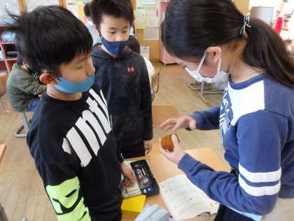 今日は、実際に角柱を見ながら、頂点、側面、辺の数を調べました。表にすることで、数のきまりに気づくことができました。