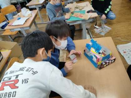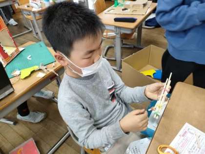 これまでに学習した、風やゴム、音、磁石等の性質を利用して、おもちゃづくりを行いました。今日は、完成したおもちゃで、友達と交流して楽しみました。