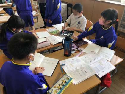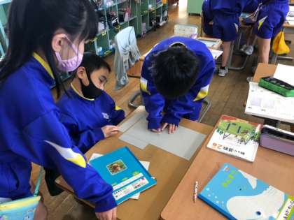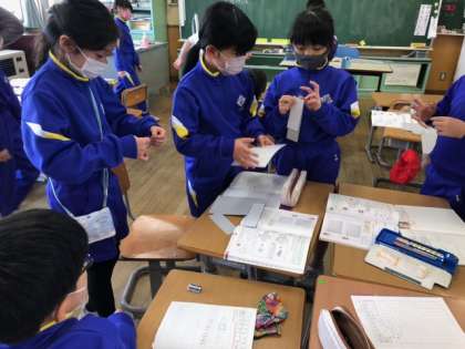 グループで協力して、切り取った面をテープでつないで、はこを組み立てました。