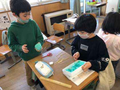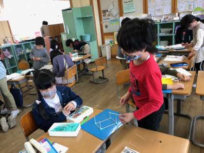 竹ひごと粘土を使って、箱の形を作りました。ペアの友達と協力しながら、辺の数や頂点の数を調べることができました。
