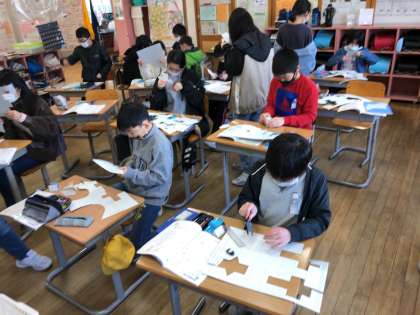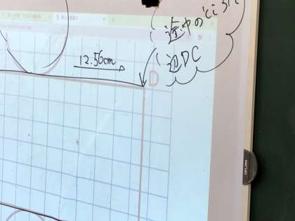 昨日は角柱の展開図をかきました。今日は円柱です。マス目ぴったりにならない辺をどのようにかいたらよいかをみんなで考えながら学習を進めました。