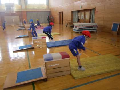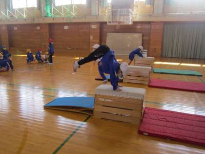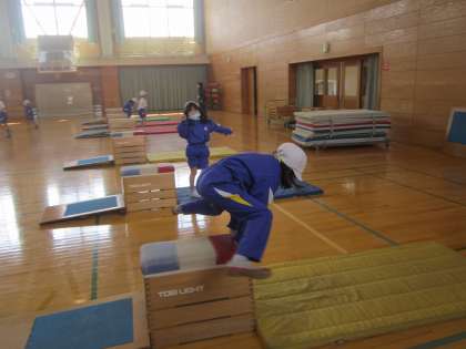 3段、4段の跳び箱を跳びました。しっかり手をつくこと、強く踏み切って跳ぶこと、跳んだ後の着地に気を付けて跳んでいました。跳び箱を跳べるようになる子が増えてきました。