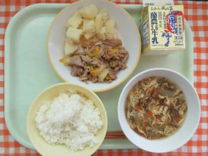 今日の献立は、ごはん、豚肉のキムチ炒め、こふきいも、卵ともずくのスープ、牛乳です。