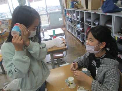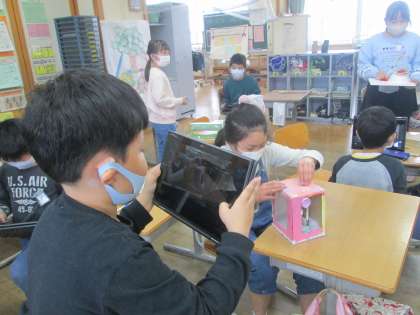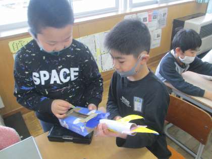 磁石やゴムなどの性質を使ったおもちゃが完成しました。お互いのおもちゃで遊んだり、記念にクロームブックで撮影したりしました。