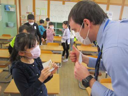 今日はリチャード先生との外国語活動がありました。「What's your name?」「My name is〜.」の話し方を教えてもらいました。人気のキャラクターを使って、ゲームをしたり歌を歌ったりして、楽しく活動していました。