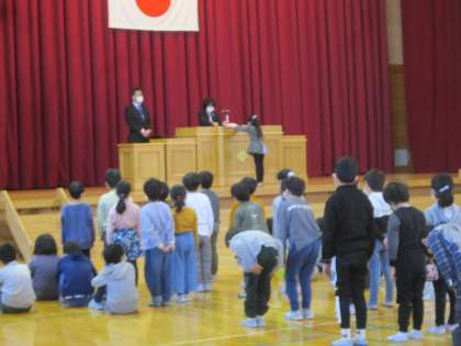 修了式で、代表の児童が修了証を受け取りました。1年間よくがんばり、たくさんの成長を見せてくれた子供たちでした。