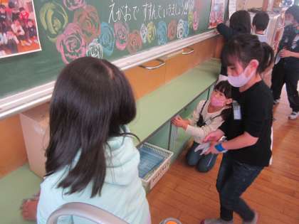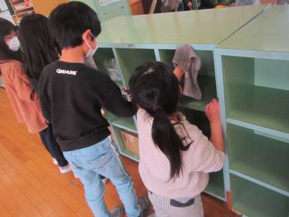 修了証を受け取った後に、最後の掃除を行いました。机やいす、ロッカー、下足をきれいに拭きました。「ありがとう。」と言いながら、丁寧に磨く子供たちの姿が見られました。早く終わった子が、黒板の下の棚や空いているロッカーの中を進んで拭いてくれました。