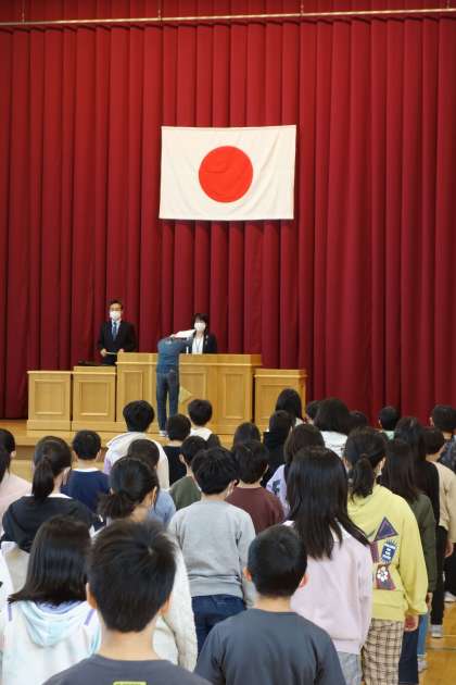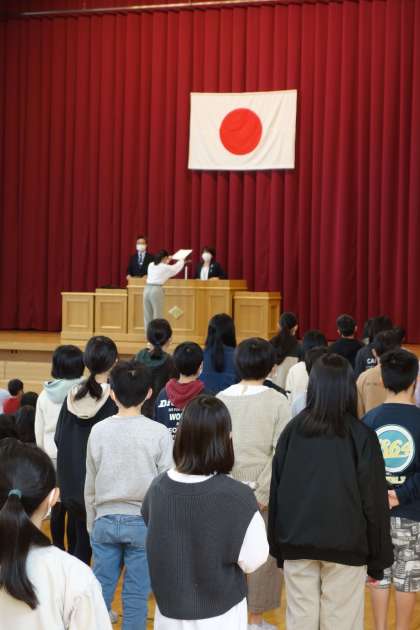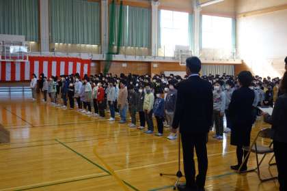 本日の修了式の様子をお伝えします。写真は、修了書授与の様子です。(中:5年生、下:4年生)