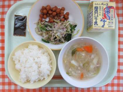 今日の献立は、ごはん、ひよこ豆のフライビーンズ、ゆかりあえ、豚汁、のり佃煮、牛乳です。