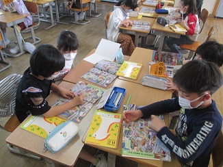 各学級の授業の様子です。図画工作科では、筆の使い方や水の量を工夫して様々な線をかきました。社会科では、教科書の挿絵を見て、建物や道路、人の様子について気付いたことをグループで話し合いました。