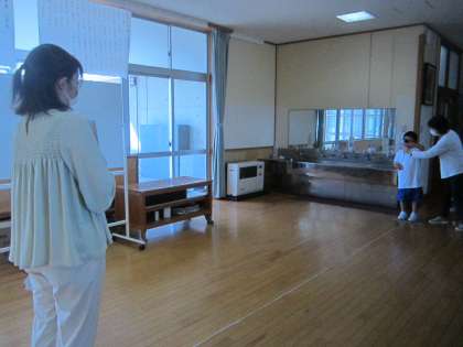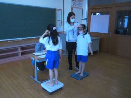 視力測定と身体測定をしました。先生の指示を聞いて、しっかりと測ることができました。