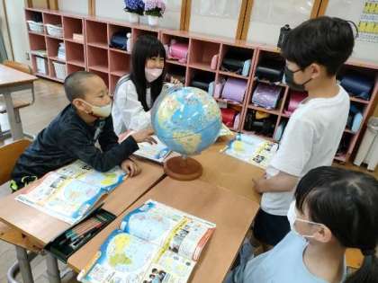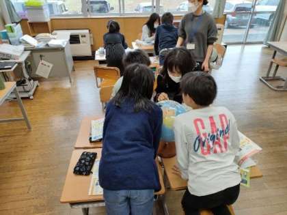 地球儀を見ながら、自分の国の場所や知っている国、今話題になっている国等をさがしました。日本の位置や、世界にはいろんな国があることを知りました。