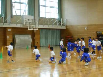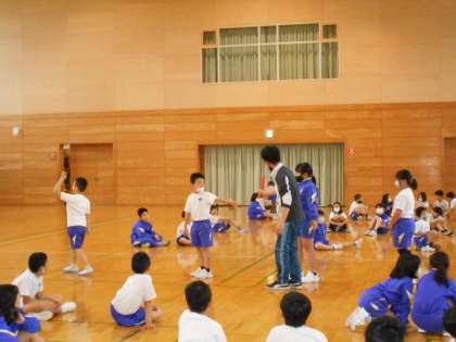 リレーのバトンパスを行いました。渡す方と、受け取る方それぞれのポイントを意識しながら、繰り返し練習しました。最後には、お試しで実際にリレーをしてみました。
