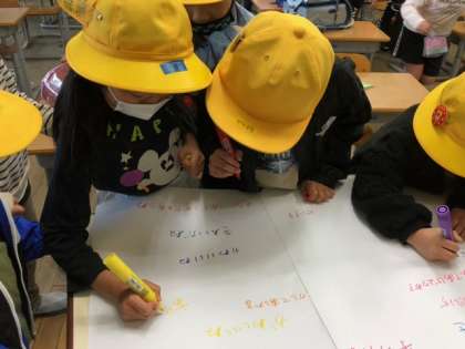 心がぽかぽかする言葉をたくさんあつめました。授業の後に、自分のお気に入りの「ぽかぽか言葉」をみんなで書きました。「もう一つ見つけたよ!」「明日も書きたいな」と嬉しそうな様子でした。