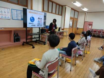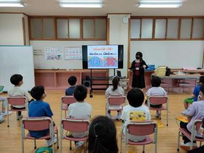 座学では、生活安全交通課の方から、道路で自転車に乗るときに気を付けることについて、詳しく説明していただきました。車と歩行者、自転車では、それぞれの決まりがあることを知り、驚いていました。