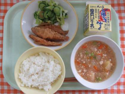 今日の献立は、ごはん、わかさぎの南蛮漬け、きざみ和え、じゃがいものそぼろ煮、牛乳です。