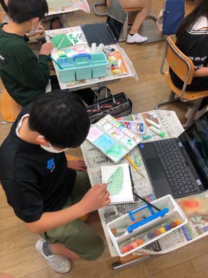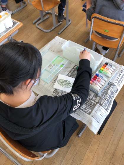 葉にある線を一生懸命かいたスケッチに色付けを行いました。濃淡を意識して色を付けることができました。ワークスペースに掲示していますので、学習参観の際にご覧ください。