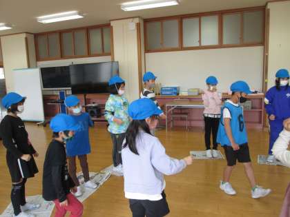 結団式後は、6年生のリーダーとともに、縦割り班活動がありました。新聞紙じゃんけんをして仲を深めていました。