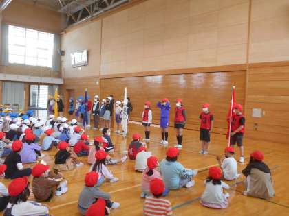 結団式で、5年生の応援副団長が前に出てあいさつしました。