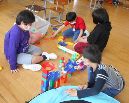 業間に、のぞみ級の遊具でみんなで遊びました。上級生が遊び方を教えたり、組み立てたりして、1年生の友達が楽しめるようにしてくれました。