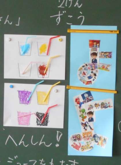 学習参観で行った「ジュースやさん」(1年生)「好きなもの教えて」(4,5年生)の作品が仕上がりました。