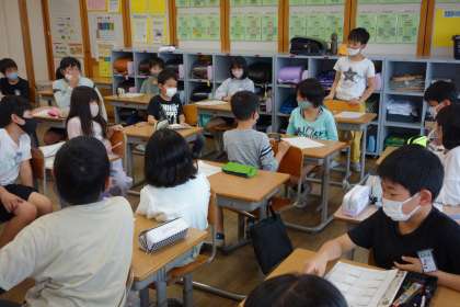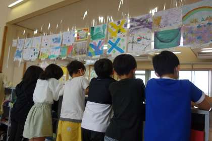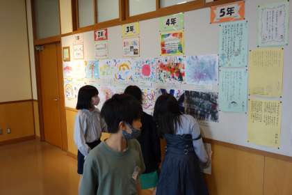 作品鑑賞を行いました。友達の作品には、自分の作品にはない魅力がたくさんあります。その魅力に気付き、用紙にたくさん魅力を書き込む子供たちでした。