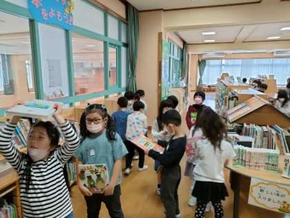 図書室の使い方を学習しました。学校図書館司書の先生から、本を紹介してもらったり、本の借り方を教えてもらったりしました。早速、お気に入りの本を見付けて、大喜びの子供たちでした。