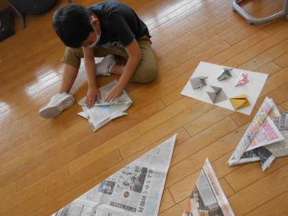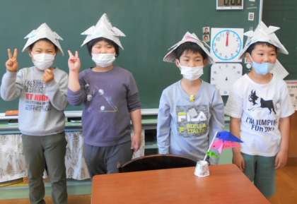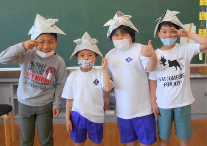 もうすぐ「こどもの日」。5年生が下級生のために新聞紙で兜を折ってくれました。