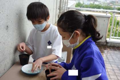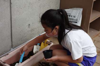ヘチマの種を植えました。3年生のときに学習した植物の種との比較をし、違いに気付きました。芽が出るように、世話を続けましょう。
