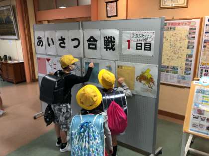 運動会の開催に合わせて、運営委員会では、「あいさつ合戦」の取組を始めました。元気なあいさつをしてくれた宮野っ子にシールを渡し、その数を競い合うというものです。