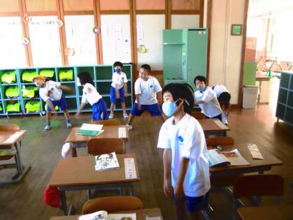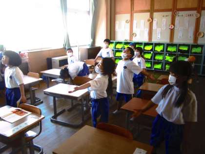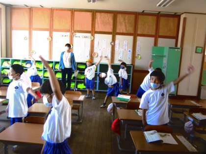 業間にラジオ体操の練習です。大きく体を動かして体操していました。