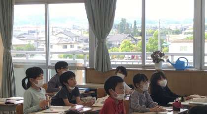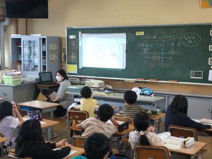 デジタル教科書を使いながら学習を進めています。子供たちも釘付けです。