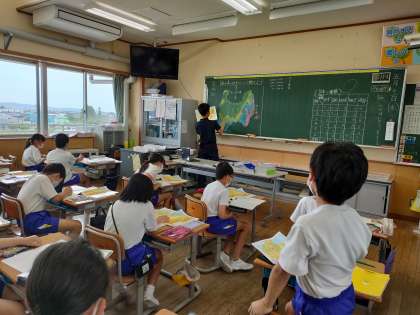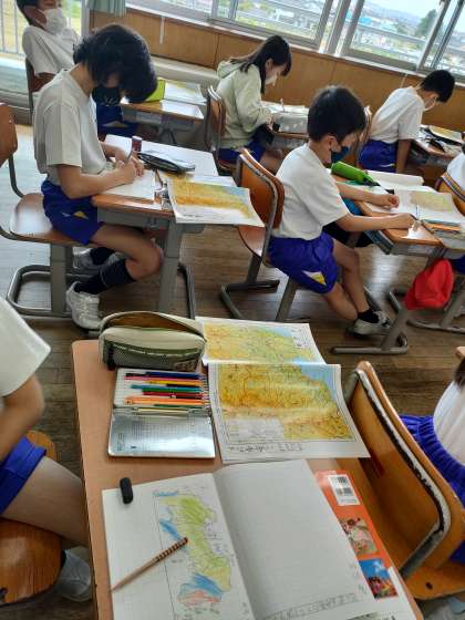 富山県の地図を描き、標高ごとに丁寧に色を塗りました。富山県の地形は、どんな特徴があるかな?自分たちが住んでいるところは、どんなところかな…と、考えました。色別にすると、とても分かりやすいです。